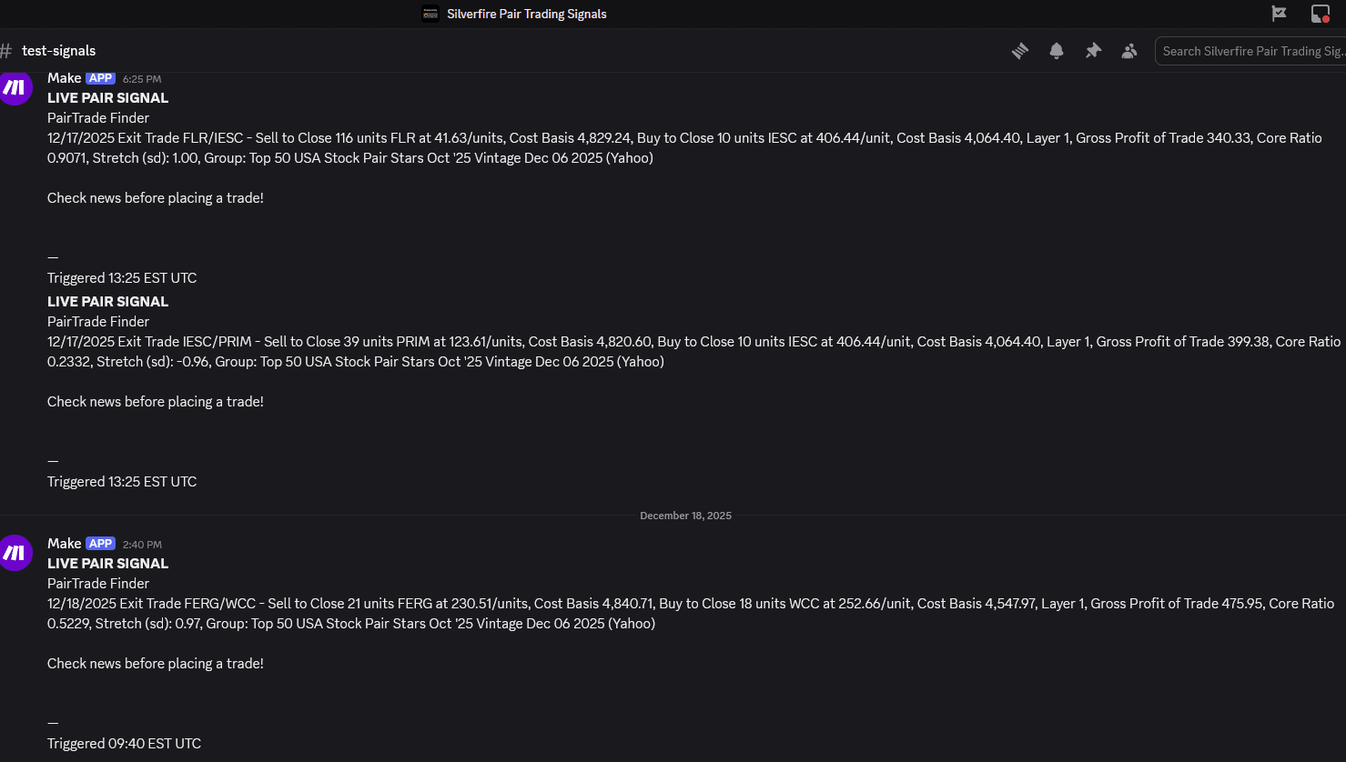 Silverfire Research is different—and as far as available evidence shows in early 2026, we're the only provider delivering near-real-time US stock pair trading signals directly to a private Discord channel.